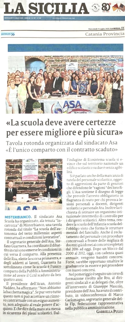 Luglio è mese di vacanze estive, ma il sindacato ASA Scuola “non si ferma”. Infatti domenica 6, presso la tenuta Incarrozza di Misterbianco (CT), ha organizzato una tavola rotonda intitolata “La scuola dell’autonomia del terzo millennio: aspetti contrattuali e condizioni lavorative” alla presenza dei massimi esponenti nazionali Stefano Guarnera e Giuseppe Mascolo ed in collegamento da remoto il segretario generale della Flp Marco Carlomagno, per affrontare insieme al proprio esercito di RSU elette lo scorso aprile, nonché ai numerosi addetti ai lavori presenti in sala, le problematiche del comparto. “Alle proposte sindacali di elevato spessore è seguito un corso di formazione rivolto oltre che alle Rsu, anche ai dirigenti sindacali e ai delegati. “Il delicato momento – afferma il segretario generale nazionale Stefano Guarnera – ma anche lo scenario che stiamo attraversando a livello mondiale, certamente avrà ricadute negative sul comparto scuola, con stipendi non adeguati, rinnovi dei contratti di lavoro al ribasso e mancata valorizzazione del personale. Non riusciamo a capire come mai non si riescano a trovare idonee soluzioni atte a migliorare il funzionamento del nostro sistema scolastico”. “Sulle tematiche emerse l’impegno dell’ASA, organizzazione sindacale aderente alla Flp, federazione sindacale rappresentativa nella Pubblica Amministrazione, nonché alla Cse (Confederazione Indipendente Sindacati Europei), sarà costante e sempre più incalzante nei confronti degli organismi istituzionali preposti, ai quali faremo sentire con forza la voce dei lavoratori, sottoponendo le necessità degli operatori del comparto”.